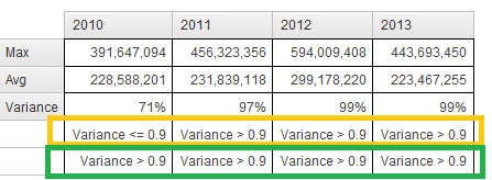 Add Query Item Variance1, and then add it as a new Row, select intersection and mark define contents as Yes